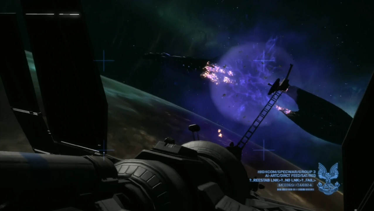 > A UNSC VTOL ship, the Hornet. In mission “Tip of The Spear” Noble attempts to disarm a Covenant Spire. Instead of lowering Noble operatives nearby, the pilot drives straight into the Spire’s shield causing system failure, resulting in an unessecary crash.