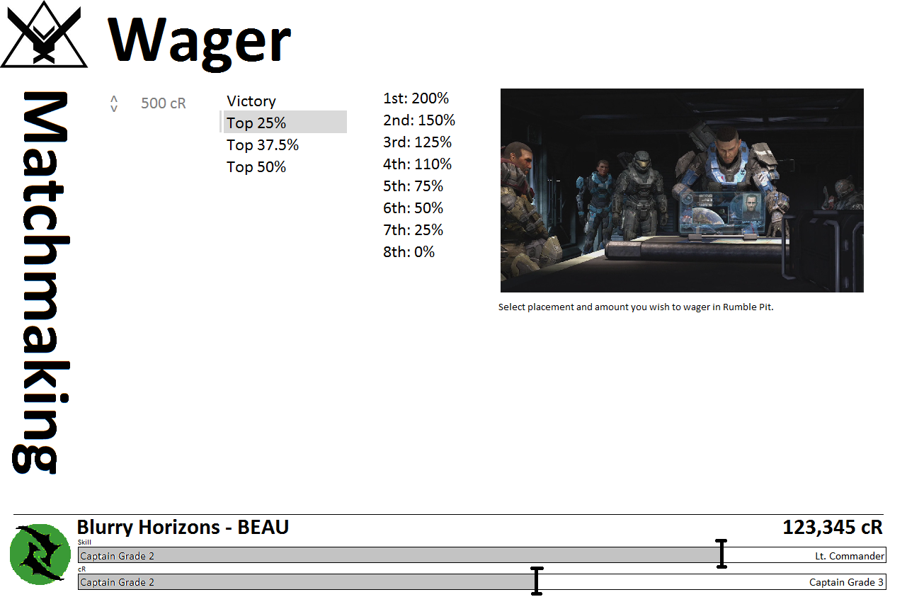 The concept of wagering for regular matches would be fairly limited just ot make for more credits and would compleltely optional, like turning on further search preferences. Bounty Hunters would serve as the specific playlist for High Stakes bets and would require differnt levels of anty.