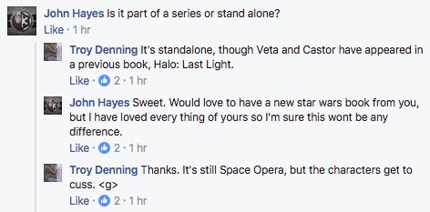 For TroyDenning, since you’re here (still I hope), have you thought of writing more Star Wars books? I don’t believe I’ve read any of yours, but from what Wikipedia says you haven’t released a SW book in four years.