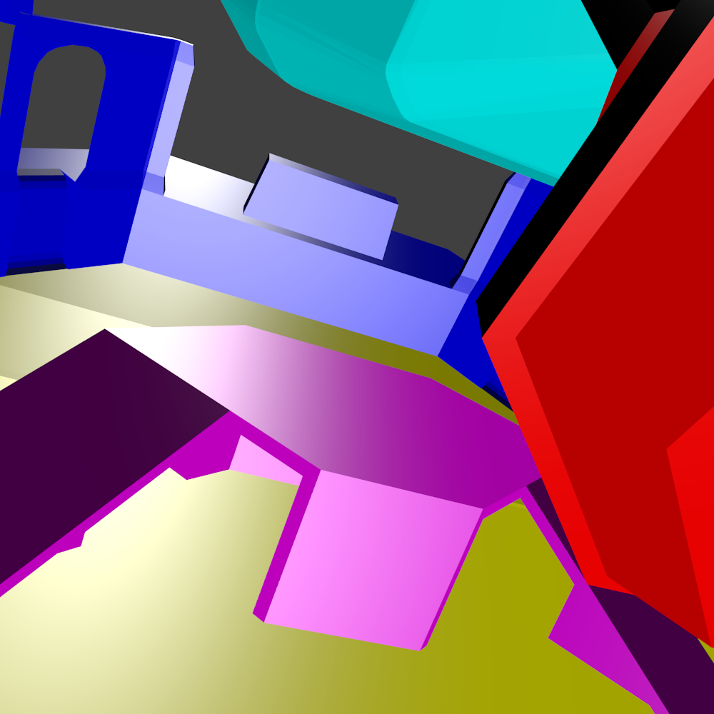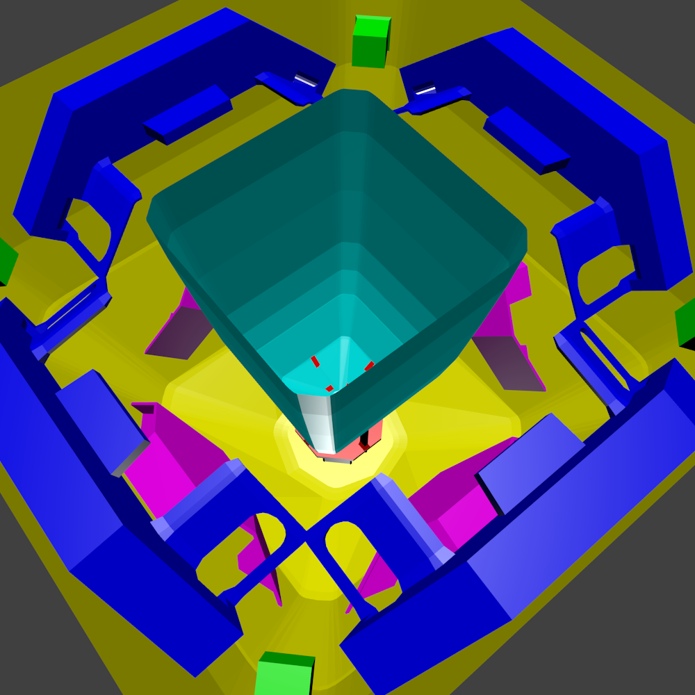 Blue are the bases, Yellow is the ground, purple are the platforms between the center platform and the bases. Red is center room and platform, Cyan is the roof and green are the teleporter rooms.
