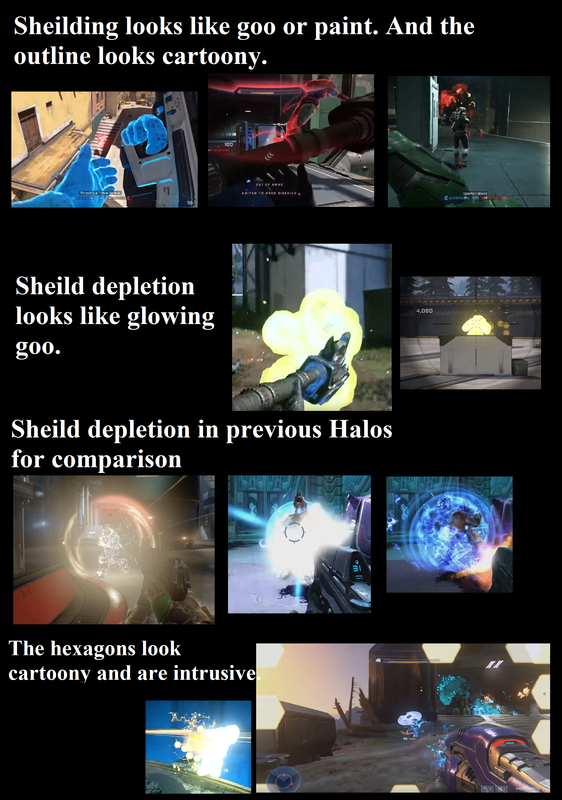> > That goo look also occurs when the shield depletes, as bright glowy goo around the player. The shield depletion looked much better in Halo 5 and CE Anniversary. Also why the hexagons?