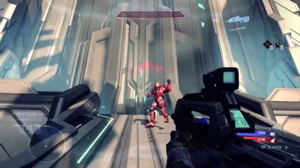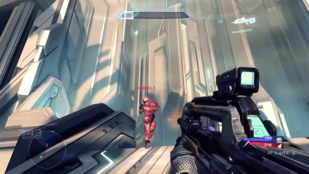 You sprint towards the shotgun, hoping that nobody enters the far end of the hall, because your shield has just started to recharge. To your disappointment your not that lucky. The far side of the hall, you see a flash of Red, and then a hail of BR bullets whizzing past your head. As you are almost at the shotgun, you glimpse at your radar, only to see that there is an enemy outside the entrance to the hall, just across the shotgun’s spawn location, your boxed in, no matter you think, I;ve been in stickier situations before.