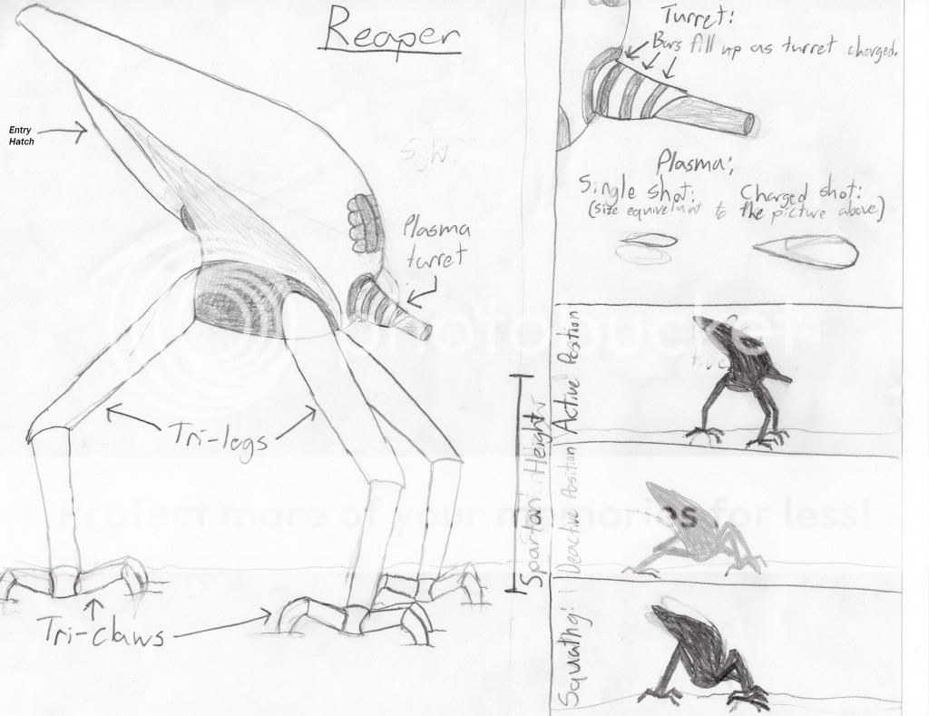 > The Reaper is a tri-legged walking beast that has a body that looks like a Banshee. It shoots plasma bullets out, and if you hold the trigger, it charges and shoots a fuelrod-like burst. It is bascially a giant plasma pistol. Maybe it could be named plasma cannon?
