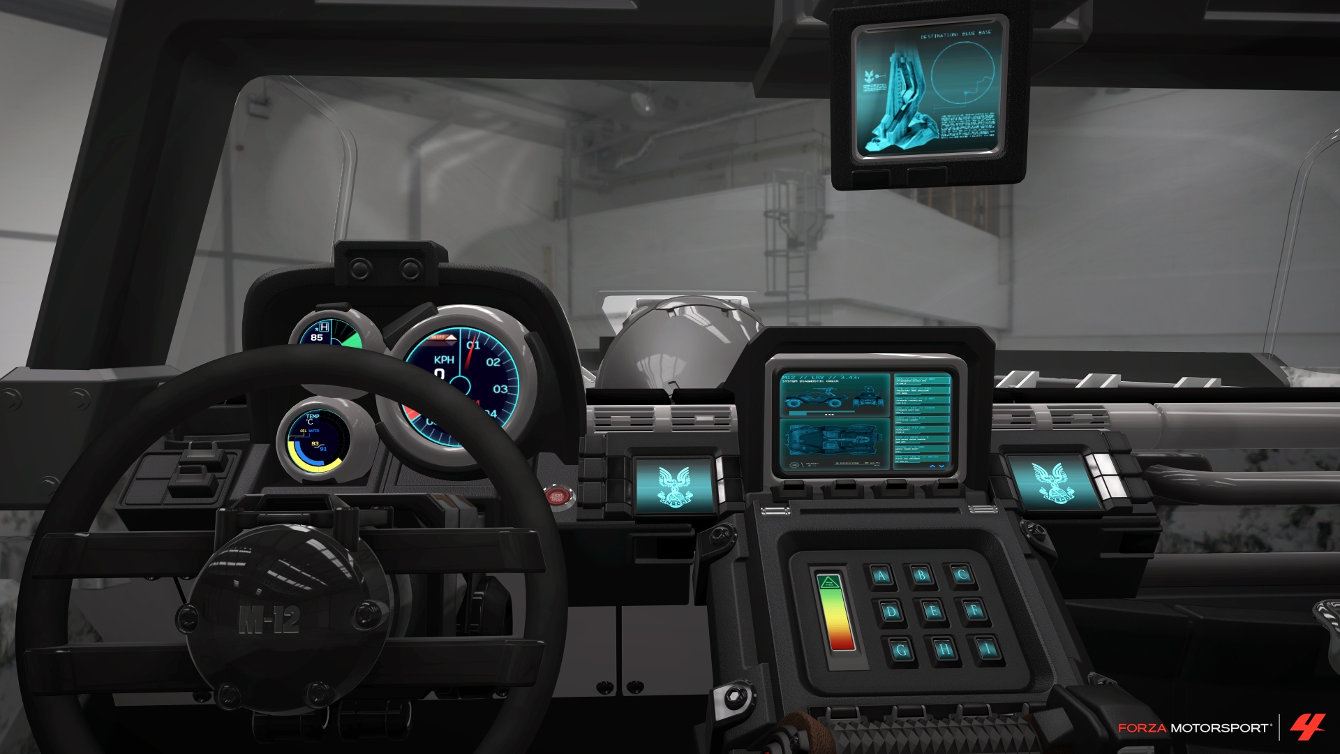 Check out this screenshot of the Halo 4 Warthog dashboard from Forza 4. Look at the image on the screen above the center console.